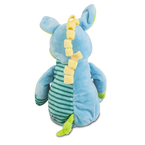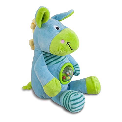 Gitzy Wattle Animals are the perfect gift for any newborn. This soft, huggable plush Wattle Animal in Blue from Gitzy features bright colors and patterns, friendly embroidered features, a 'taggy' mane and a spinning rattle that can help develop your baby's fine motor skills while keeping them entertained! - Perfect size for baby, measures 9" when sitting