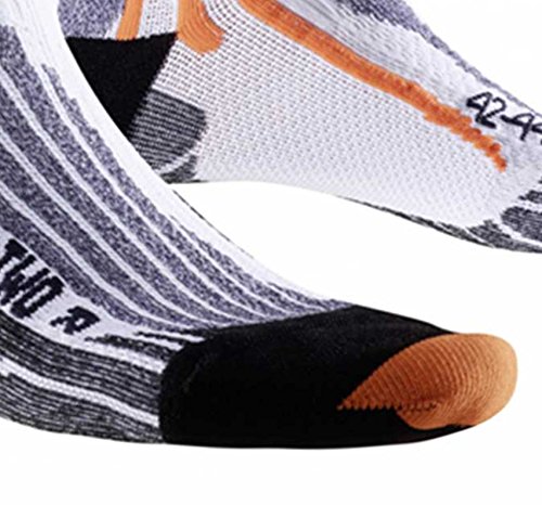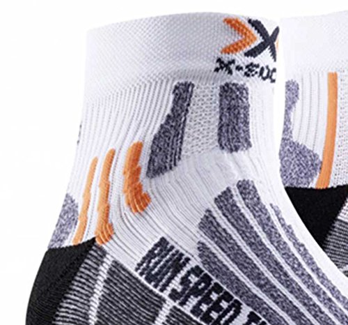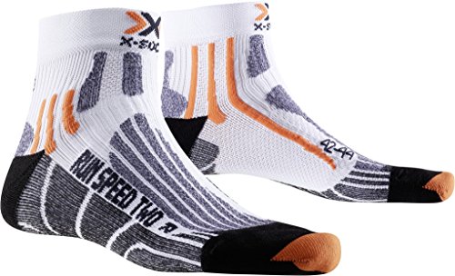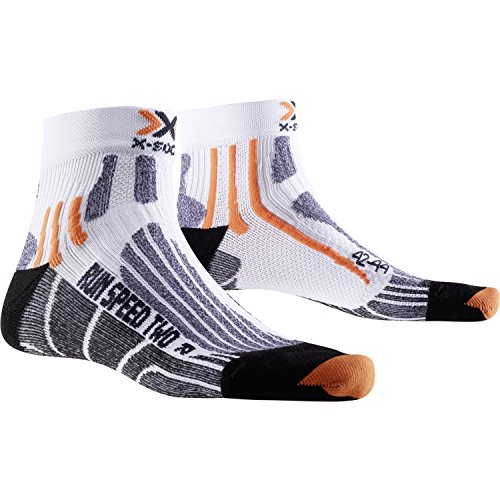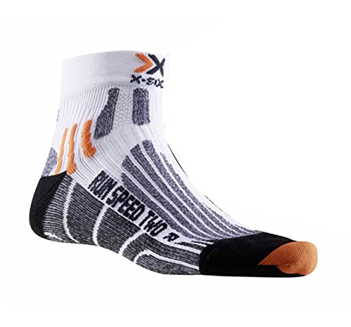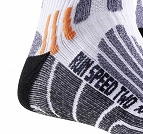 Studio : X-Socks Publisher : X-Socks Binding : Sports Apparel Product Description The perfect sock for quick sprints on long and medium-range runs. At every powerful step, shock waves and shocks are generated. These are derived by the combination of special cushioning zones and ventilation ducts. The new patented Lambertz-Nicholson Achilles tendon padding with its cut-out area acts as a spacer, prevents friction and skin abrasions. The pads on the toes, the heel and the heel protect the foot all around. With the 25% improved air guidance system, by optimizing the canal system around the foot, the fresh air in the shoe can circulate better 8x. The X-Socks Run Speed Two are an absolute must for all hobby and profile runners. X-Cross Bandage supports the sensitive ankle area AirConditioning-Channel pumps out humid and overheated air step by step 0