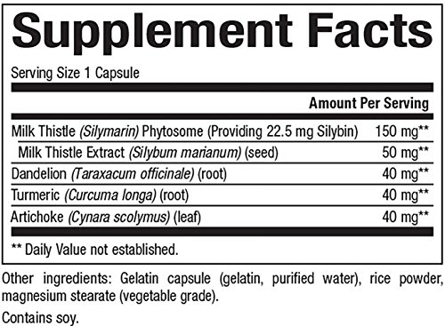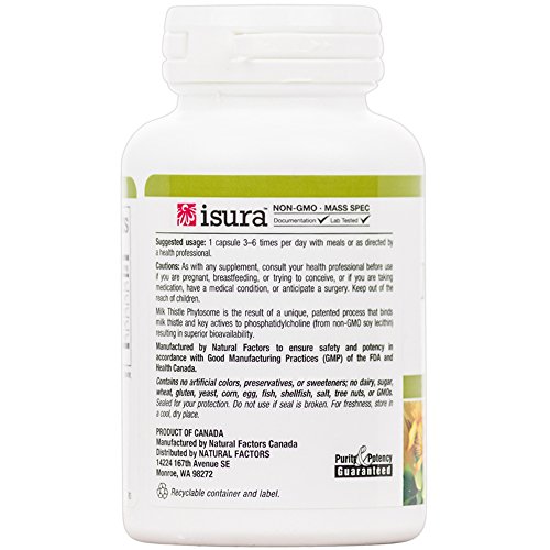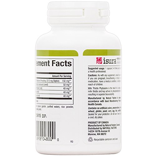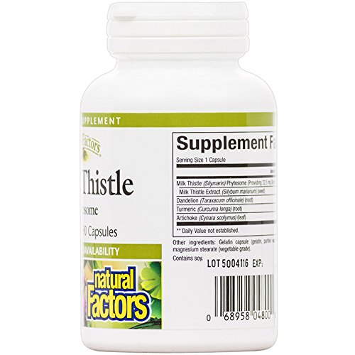 Studio : Natural Factors Publisher : Natural Factors Binding : Health and Beauty Product Description Natural Factors Milk Thistle Phytosome capsules are standardized to 80% Silymarin, a mixture of valuable flavonolignans, bound to phosphatidylcholine (from lecithin) to enhance bioavailability. Numerous clinical studies show that Silymarin supports and promotes liver function in healthy individuals, providing an antioxidant effect on the liver, fortifying it. Dandelion, artichoke and turmeric have been traditionally used and scientifically studied for their support of liver health and have been added to enhance the formula. (Phytosomes are herbal substances that are combined with phosphatidylcholine molecules to enhance absorption and bioavailability. This new molecule is both water and fat soluble.) 0