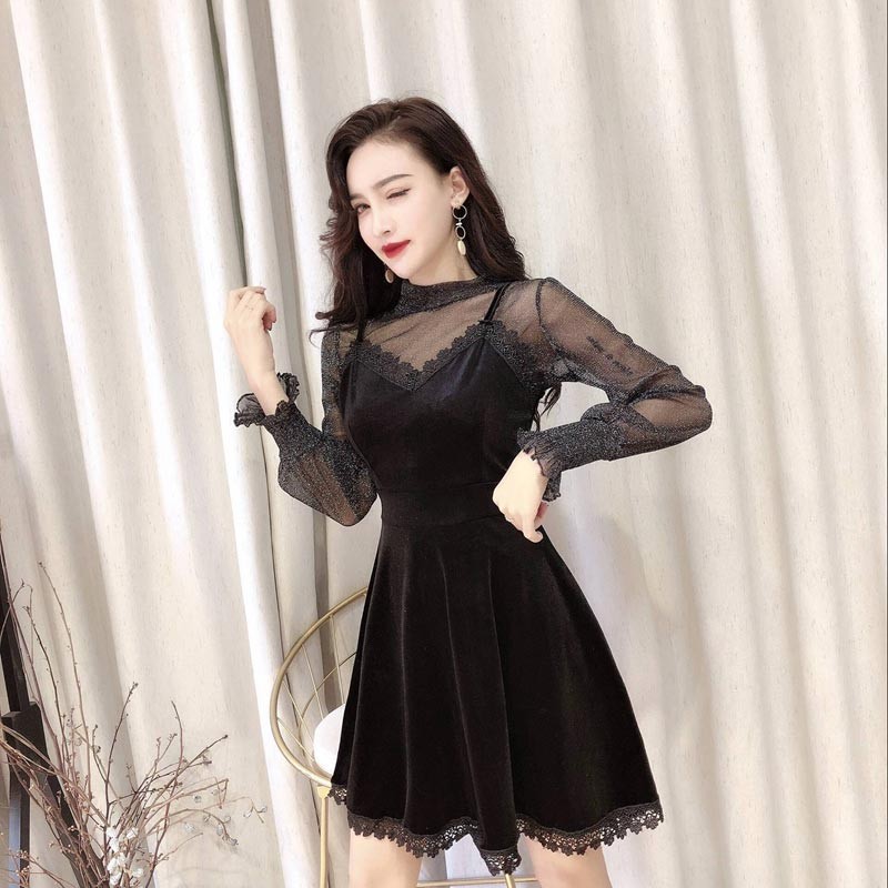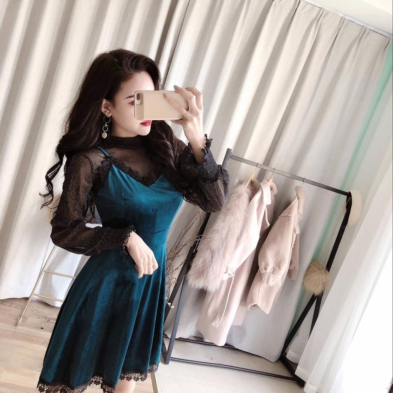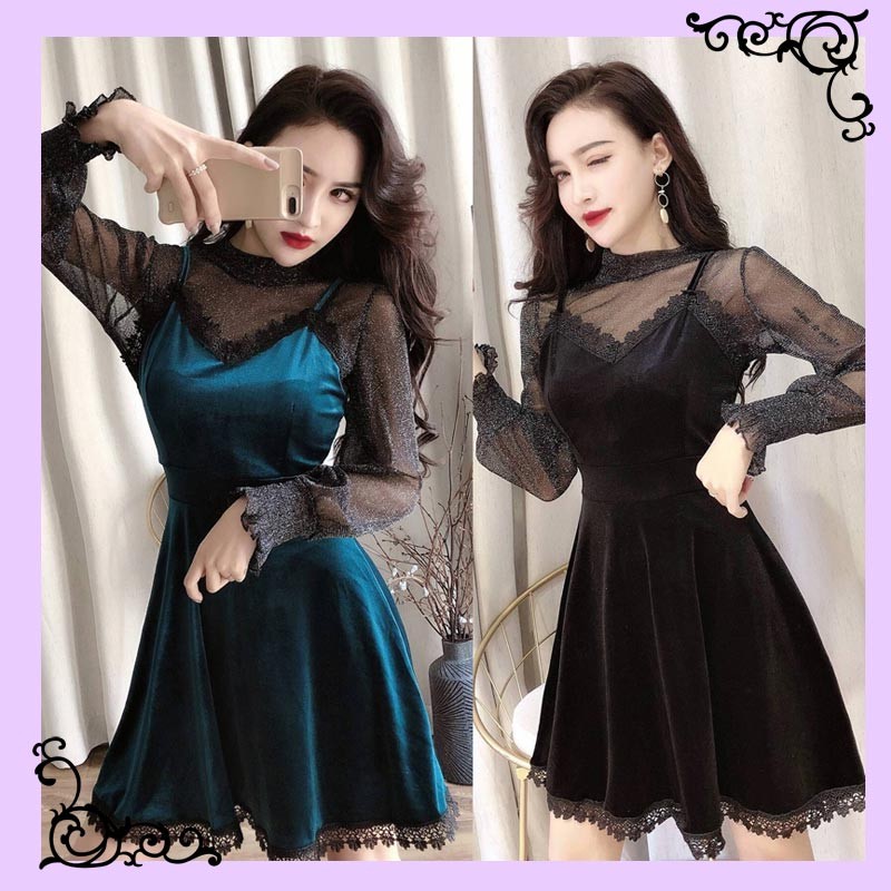 Vネック・レースで縁取ったベルベットドレスとレーシートップスのセットアップ♪