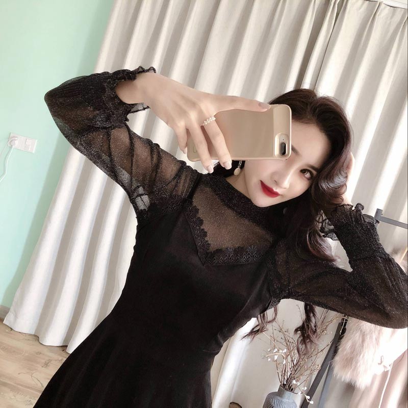 ハイネックのレーシーなトップスはラメ感があってエレガントなデザインです!