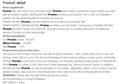 -. Binding : Health and Beauty -. Brand : USA -. Label : USA -. LegalDisclaimer : EXP 04/15 -. Manufacturer : USA -. ProductGroup : Health and Beauty -. ProductTypeName : HEALTH_PERSONAL_CARE -. Publisher : USA -. Studio : USA -. Title : Nutrilite All Plant Protein Powder NET Weight: 450 G. By Amway Lot of 2