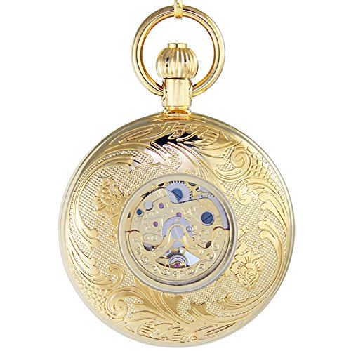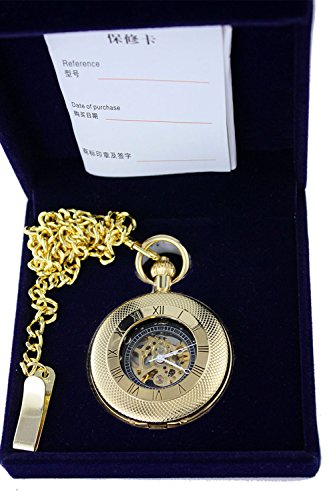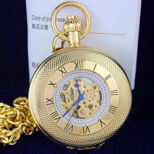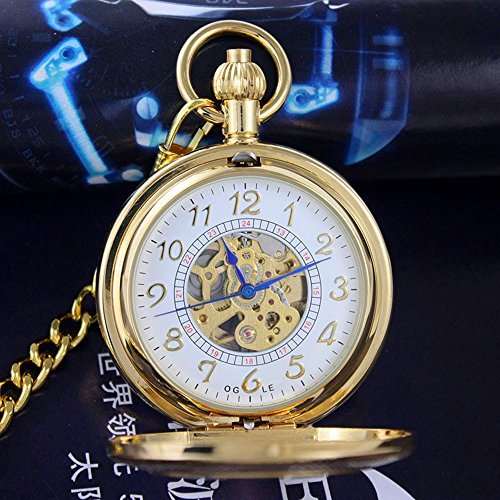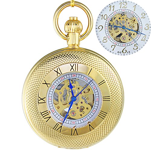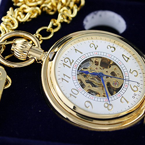 -. Title : OGLE Waterproof Gold Roman White Chain Fob Self Winding Automatic Skeleton Mechanical Pocket Watch