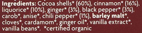 -. Feature : Contains pure South American cocoa shells. / Ayurvedic exotic spiced recipe / Contains pure cocoa, ginger and cinnamon. / Allow to steep for 7 minutes in boiling water. / No E numbers or GM
