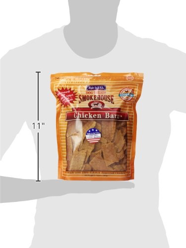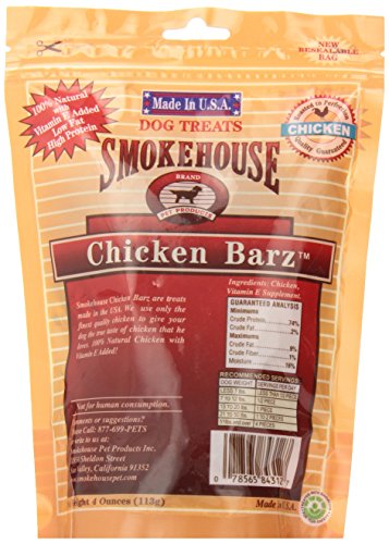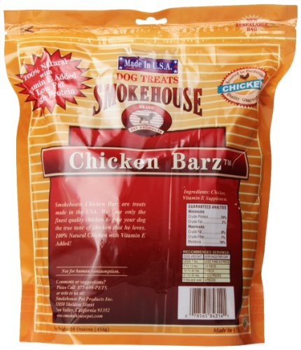 -. Binding : Misc. -. Brand : SmokeHouse -. Feature : 100-percent USDA inspected chicken breast / Slow roasted to perfection for a rich savory flavor / High protein dog treat that is great as a training aid or reward / A tasty healthy treat with the real flavor of chicken / Made in the U.S.A -. Label : Smokehouse -. Manufacturer : Smokehouse -. PackageQuantity : 1 -. ProductGroup : Pet Products -. ProductTypeName : PET_SUPPLIES -. Publisher : Smokehouse -. Studio : Smokehouse -. Title : Smokehouse 100% Natural Chicken Barz Dog Treats