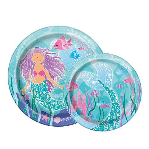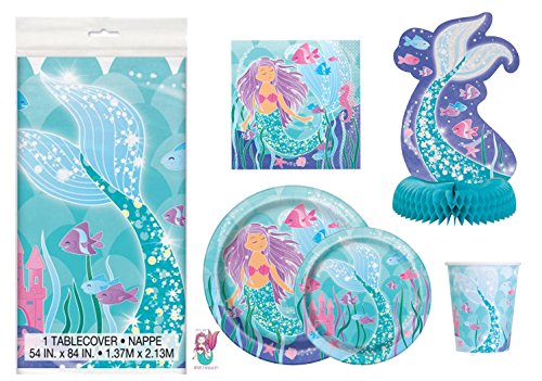 Deluxe Mermaid Birthday Party Supplies Pack - Serves 16 - Tablecloth, Plates, Napkins, Cups and Centerpiece Decoration