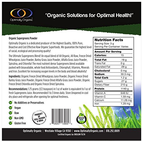 -. Feature : Mix of all-organic, all-raw, freeze-dried wheatgrass juice powder, barley grass juice powder, alfalfa grass juice powder, spirulina, and chlorella / Raw / Organic / High quality supergreens powder / 1/2 Lb