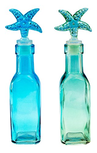 Ocean Blue and Sea Green Tall Glass Bottles with Starfish Stoppers Set of 2