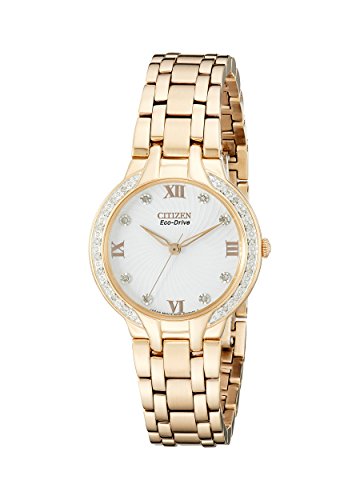 -. Binding : Watch -. Brand : Citizen -. Color : white -. Department : womens -. EAN : 0696737516565 -. Feature : Eco-drive is fueled by light, any kind of light, so it never needs a battery / Rose tone stainless steel case and bracelet / 20 diamond bezel and 8 diamond dial / Mineral crystal / Water resistant to 99 feet (30 M): withstands rain and splashes of water, but not showering or submersion -. Label : Citizen -. Manufacturer : Citizen -. Model : EM0123-50A -. MPN : EM0123-50A -. PackageQuantity : 1 -. PartNumber : EM0123-50A -. ProductGroup : Watch -. ProductTypeName : WATCH -. Publisher : Citizen -. ReleaseDate : 2013-03-15 -. Studio : Citizen -. Title : Citizen Women's EM0123-50A Eco-Drive Bella Diamond Accented Watch -. UPC : 709251313449