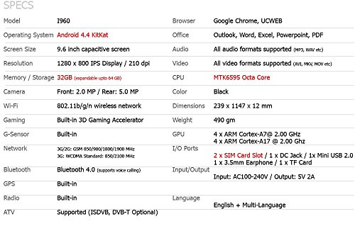 -. Feature : [Color: BLACK] 9.6" inch Newest PHABLET (Tablet +Phone) features a powerful, Octa Core processor, plus the Android 4.4 system for 60% faster than previous dual core tablets, more fluid performance. Apps lauch quickly, games and videos play smoothly. / 1280x800 HD IPS Display. DUAL SIM Card Slots. UNLOCKED for use worldwide. Works on GSM & CDMA bands. Dual Camera, inbuilt speakers, WiFi + Bluetooth ready. 3D Gaming Accelerator comes installed. Comes with Google Play Store and other popular apps. / Android 4.4 KITKAT [OCTA CORE] Processor w/ 2GB RAM and 32 GB Storage (expandable upto 64GB via SD Card). NOT Compatible with WCDMA (Verizon, SP.R.Int, etc) network within USA. / MTK6595 Processor. GPS & FM built-in. Supports 2160P HD video playback, 2160P decoding. Ultra-fast web browsing over built-in Wi-Fi (802.11 a/b/g/n). / NOW AVAILABLE: 10.1" 2GB-RAM/64GB Storage Android 5.1 Lollipop IPS Display GPS Tablet. Search for "B01BJ8CE8C" on Amazon.