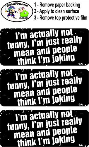 -. Brand : Sticker Pirate -. Feature : Three (3) - 1 1/4" x 3" Hard Hat Stickers / "Peel and Stick" / 100% Satisfaction Guaranteed / Order $5 or More From StickerPirate and Receive Free Shipping!!!! / $.60 Flat rate shipping on all orders under $5 -. Label : StickerPirate -. Manufacturer : StickerPirate -. ManufacturerPartsWarrantyDescription : Parts -. MPN : BS320 -. PackageQuantity : 1 -. PartNumber : BS320 -. ProductGroup : Automotive Parts and Accessories -. ProductTypeName : AUTO_ACCESSORY -. Publisher : StickerPirate -. Studio : StickerPirate -. Title : 3 - I'm Actually Not Funny, I'm Just Really Mean And People Think I'm Joking 1 1/4" x 3" Hard Hat Biker Helmet Stickers Bs275