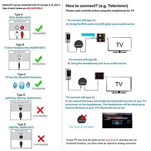 -. Feature : Allows you to P.R.Ivately enjoy any TV program without disturbing others. [[ Hammo TV ONLY works with TV's with either a RCA Audio OUT or a 3.5mm headphones Audio OUT; If your TV has none of these plugs, please DO NOT BUY. Or if your TV has only an optical digital audio OUT or simply a digital audio OUT, an optical to analog converter is then required and please purchase at your own needs, otherwise, please DO NOT BUY. ]] / The digital wireless technology provides resistance to RF interference and very little perceived static. / Accurate, clear and similar home theater sound effects. / Low-latency wireless transmission technology ensures the perfect synchronization of the television picture and the sound of the headphones. / Up to 10 meters wireless transmission distance; 50 hours ultra long battery life; Light weight, soft over ear muffs, comfortable for hours wearing.