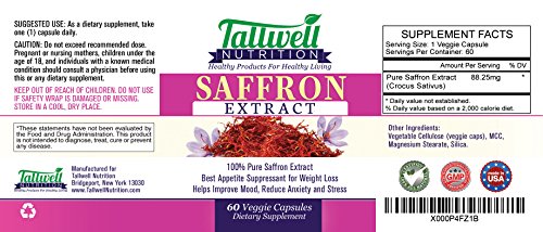 -. Binding : Health and Beauty -. Feature : Each capsule provides maximum strength 88mg. of certified Pure Saffron Extract to help suppress your appetite and reduce hunger so you can lose weight. 120 day supply. / Saffron is a very powerful herb traditionally used to help support cheerfulness, improve positive mood, harmony and balance. / Tallwell Nutrition Saffron Extract is highly concentrated and 100% Pure with No fillers, No binders or any artificial ingredients. Made in the U.S.A at an FDA inspected and GP-certified facility. / Premium Quality All Natural Diet and Weight Loss aid in easy to use clear veggie capsules. Only the best with Tallwell Nutrition. / Free Diet, Weight Loss Tips and Healthy Blog Articles included with purchase. -. IsAdultProduct : 0 -. Label : Tallwell Nutrition - Healthy Products for Healthy Living -. Manufacturer : Tallwell Nutrition - Healthy Products for Healthy Living -. ProductGroup : Health and Beauty -. ProductTypeName : HEALTH_PERSONAL_CARE -. Publisher : Tallwell Nutrition - Healthy Products for Healthy Living -. Studio : Tallwell Nutrition - Healthy Products for Healthy Living -. Title : Pure Saffron Extract - Best Appetite Suppressant for Weight Loss - 120 capsules - Maximum Strength 88mg. - Helps Reduce Anxiety and Stress - Premium Quality & 100% All Natural - By Tallwell Nutrition(tm)- Free Diet, Weight Loss Tips and Healthy Articles Blog Included with Purchase!
