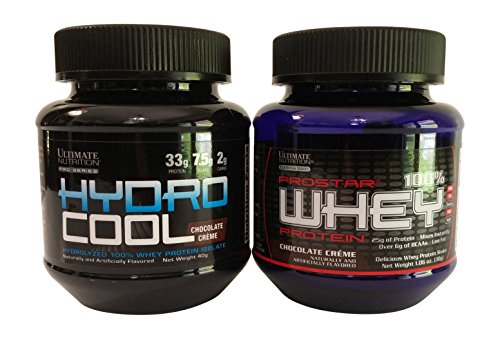 -. Feature : Convenient sample size bottles of Ultimate Nutrition HydroCool 100% Whey Protein Isolate Chocolate and Prostar Whey Chocolate / HydroCoolTM is a fast-acting, ultra-pure hydrolyzed whey protein isolate (HWPI) blend of multiple degrees of hydrolysis. / HWPI has been processed with a mixture of enzymes similar to those found in the human digestive tract. These enzymes break down whey protein isolate into smaller fractions called peptides. / One serving of HydroCool provides 33 grams of premium-quality hydrolyzed whey protein isolate, over 15 grams of naturally-occurring essential amino acids (EAA) and over 7.5 grams of naturally-occurring branched chain amino acids (BCAA). / One serving of Prostar Whey Chocolate Creme: Whey protein isolate, whey protein concentrate and whey peptides, contains 25 grams of protein.