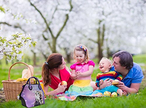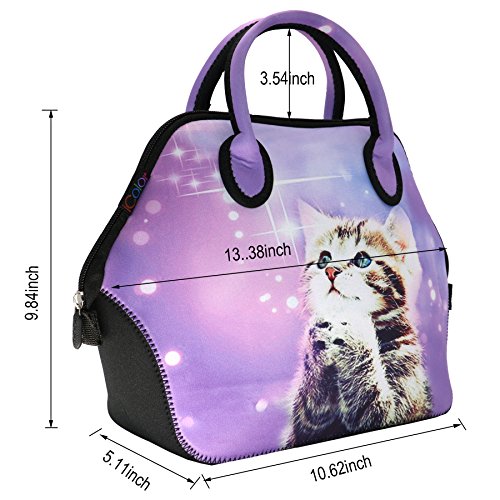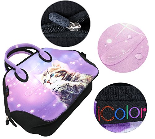 ICOLOR Women and Teen Girls Downtown Large Size Insulated Neoprene Lunch Bag with Reusable Zip Closure Handbag,Stylish Adult Lunch Box For Outdoors,Work,Office, School,Shopping,Gym(Purple Wish Cat)