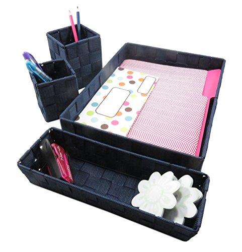 Desk Set Organizer Woven Strap Letter Tray Pencil Holders (4 Piece) Navy Blue