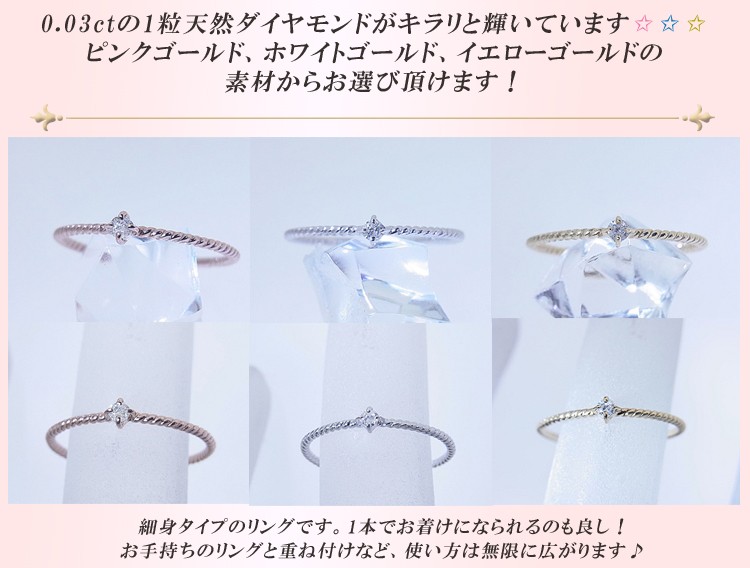 0.03ct天然ダイヤモンドが輝く細身タイプのリングです。ピンクゴールド、ホワイトゴールド、イエローゴールドの素材からお選び頂けます。