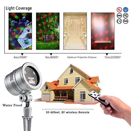 【WIDE COVERAGE&REMOTE CONTROL】-This Laser Light could cover up to an area over 3000 square feet.It can be used for outdoors and indoor activities.For a better version,this projector provides the remotecontrol,which will be very convenient especially in raining or snowing days.