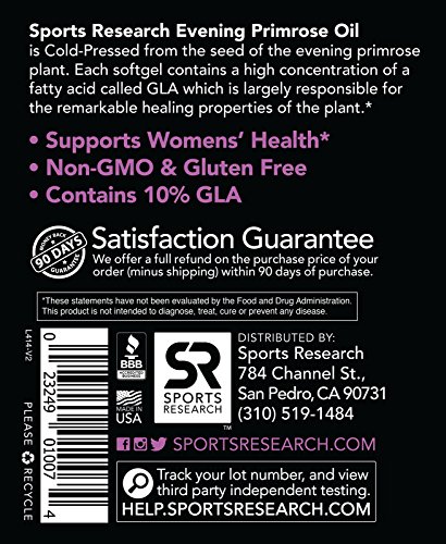 -. Binding : Health and Beauty -. Brand : Sports Research -. EAN : 0023249010074 -. Feature : FEATURES: 1300mg of Pure Evening Primrose Oil (EPO). Rich in Omega-6 and 9 each liquid softgel is guaranteed to Contain 10% GLA (Gamma-linolenic acid).* / NATURAL: Plant Derived, hand harvested and Cold Pressed from the seed of the Evening Primrose Plant. / BENEFITS: Helps Maintain Healthy Skin, Prostaglandin levels & a Balanced Immune Response.* / QUALITY: Hexane, Gluten and GMO Free. Formulated Without Preservatives, Soy, Artificial Colorings, Stearates Or Titanium Dioxide.* / MONEY BACK GUARANTEE: All Sports Research (SR®) products come with a full Money Back Guarantee. Click on the Sports Research Tab above to Try one of our Other Premium Products at No Risk! -. IsAdultProduct : 0 -. Label : Sports Research -. LegalDisclaimer : These statements have not been evaluated by the food and drug administration. This product is not intended to diagnose, cure or prevent any disease -. Manufacturer : Sports Research -. MPN : SR_EPO -. PackageQuantity : 1 -. PartNumber : SR_EPO -. ProductGroup : Health and Beauty -. ProductTypeName : HEALTH_PERSONAL_CARE -. Publisher : Sports Research -. Studio : Sports Research -. Title : Evening Primrose Oil 1300mg 120 Liquid Softgels, Cold-Pressed with No fillers or Artificial Ingredients; Non-GMO & Gluten Free, Made in the USA -. UPC : 023249010074