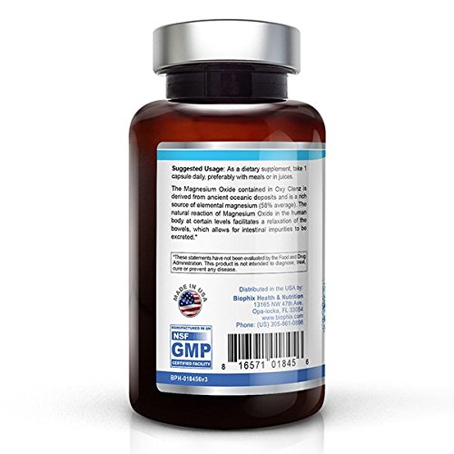 -. Binding : Health and Beauty -. Brand : biophix -. EAN : 0816571018456 -. Feature : 100% Pure Magnesium Oxide Powder / Derived From Ancient Oceanic Deposits / A Dietary Supplement -. Label : Biophix -. LegalDisclaimer : This information is intended for your general knowledge only and is not substitute for professional medical advice or treatment for specific medical conditions. This information is not intended to diagnose, treat, cure or prevent any disease. Always seek the advice of your qualified physician or other health care provider with any questions you may have regarding a medical condition. Keep out of reach of children. -. Manufacturer : Biophix -. MPN : 0816571018456 -. NumberOfItems : 1 -. PackageQuantity : 1 -. PartNumber : 0816571018456 -. ProductGroup : Health and Beauty -. ProductTypeName : HEALTH_PERSONAL_CARE -. Publisher : Biophix -. Studio : Biophix -. Title : Biophix Oxy Clenz 750 mg 120 Caps -. UPC : 816571018456