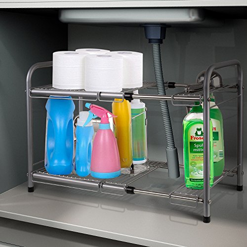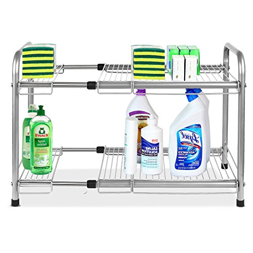 - 1.Material: Made of high grade solid coated stainless steel,this under sink rack is composed of four extra strong steel pipe supports,sturdy and durable,rustproof and corrosion resistant construction prevents rusting. keep your food sanitary and safety.