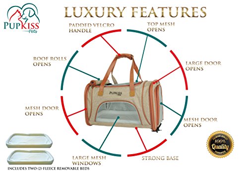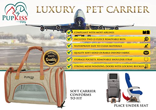 -. Feature : APPROVED AIRLINE PET CARRIER - You Do Not Have to Put Your Pet in the Cargo Area Anymore! You Don't Have to Leave Your Fur Baby Home or With Strangers Anymore! Our Airline Pet Carrier is a Soft Pet Carrier That is Easy to Secure and Store Like Personal Lage. Fit Pet Carrying Case Under Seat. Is Compliant and Meets Most Airline Regulations. Approx Dimensions-18"L X 11"H X 10.5"W. Please check your airline guidelines and requirements. / EXTRA BONUS FLEECE INCLUDED - Soiled Bedding??-Problem Alleviated! Comes With 2 Fleece Removable Beds For Easy Change Out. Fleece Bed is Supported with A Firm Base and Attaches to the Base With a Velcro Strip. / FEATURES YOU DESIRE AND TRUST - Our Design is Not Cheap! No Disappointments With Our Carrier Design. This is Constructed With You and Your Pet's Needs in Mind! Accommodates Your Travel Needs So You Can Bring Your Pet With You. Use Double Carry Handle or Removable Padded Shoulder Strap. Leash Ring, Storage Compartments, Safety Zipper Locks and Name Tag Holder. Lightweight But Sturdy Base. Many Areas to Open Mesh Windows Part or All The Way Down, So Your Pet Can Look Out, Feel Safe & Secure. / FABRIC AND MATERIALS - Our Pet Carriers offer Luxurious High Grade Matt Twill Oxford 2 Tone 900D Cation Breathable Material. Comfortable Padded Fleece Removable Insert Beds. Waterproof, Easy to Clean and Well Ventilated with Superior Durable Mesh Windows. More Comfortable and Roomy Than Others. Strong Firm Base, With Soft Sides to Conform to Under Seat Capability. Best Small Dog Carrier, Cat Pet Carrier and Small Pet Carrier. / 100% SATISFACTION GUARANTEE - We Are Completely Confident You Will Enjoy Our Dog Carriers, Cat Carriers and All Over Best Pet Carrier Bag by Pupkiss Pets, We Will Refund Your Money if You Are not Completely Satisfied. Please Note: This is Made For Small Pets. Sides Are Made to Be Able to Conform to Fit Under Airline Seating. This Not a Hard Sided Crate.