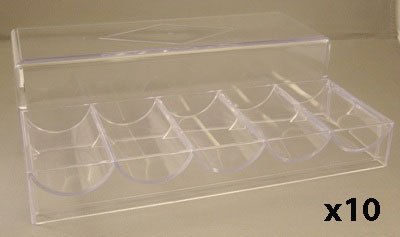 Studio : TMG Publisher : TMG Binding : Misc. Product Description This Clear Acrylic Chip Rack and Cover provide an excellent way to store your poker chips while keeping them from harms way. They provide a protective covering to keep your chips safe and organized. Chips SHOWN not included (for display purposes only). Set of 10. Features include: * Made of durable clear Acrylic * 5 Rows hold 20 chips each for a total of 100 chips * Dimensions: 3.125 x 8.375 x 2.25 inches NOTE: Chips in picture not included! You will receive 10 racks 10 covers per order. 0