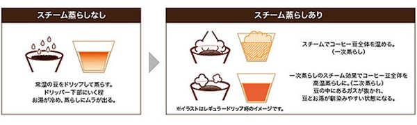 たっぷりのスチームでコーヒー粉全体を温め、高温で蒸らします。コーヒー成分を抽出しやすい状態にしてからドリップすることで、旨みとコクのあるコーヒーを実現しました。