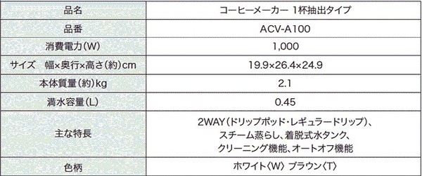 【主な特長】 2WAY(ドリップ・レギュラードリップ)、スチーム蒸らし、着脱式水タンク、クリーニング機能、オートオフ機能