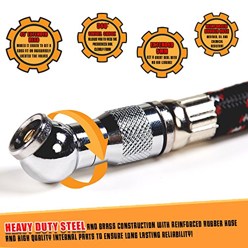 - PROFESSIONAL USED: Crafted high-quality steel, the gauge made from durable material, hose can rotate 45 degrees to fit any difficult shape, have been tested and trust by many mechanical shop, recommended for truck jdm car, german, vw, honda, toyota, subaru, mercedes benz and any automotive, bicycle.