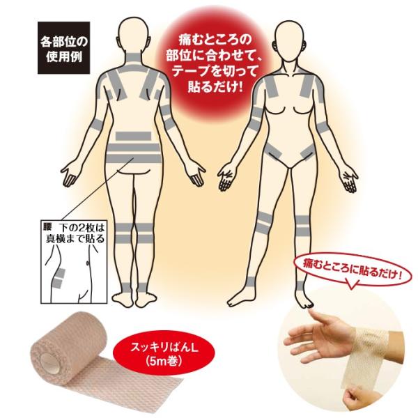 「スッキリばん」は首、肩、腕、肘、膝、腰、股関節、足首などのお悩みの個所に20分~60分間貼るだけで、気になるお悩みをスッキリ解消する健康ネットテープです。気になるところに切って貼るだけなので誰でも簡単に使用できます。薬品の成分や、磁気は一切使用していないので、臭いもなく安心してご使用になれます。※60分以上貼り続けても問題はありません。※個人差がございますが、1回のご使用でスッキリ感が感じられない場合、4~5日続けてお試しいただくことをお勧めします。※最適な時間帯は入浴後、体を拭いてから、また、動きの少ない就眠前をお勧めします。■内容量 幅7.5cm×5m■素材 不織布:ポリプロピレン100% 粘着材:アクリル系 メッシュ:ポリエステル100% ※薬品、磁気は一切使用しておりません。