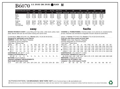 -. Title : Butterick Patterns B6070 Misses'/Women's Shirt Sewing Template, Size WMN (XXL-1X-2X-3X-4X-5X-6X)