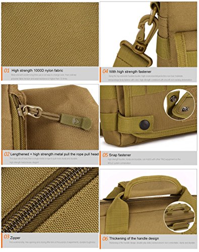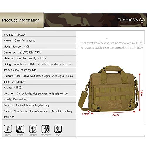 Brand: FLYHAWK Name: Tactical tablet bag(Can be Crossbody bag and handbag) Demension: 10.63 * 9 * 3.54 Inches Material: Anti-Friction Nylon Lining: Mecerized Colors: ACU Digital/Camoulage Black/Brown/Sand Camoulage/Desert Digital Wight: 15.87 Ounce Volume: Can be loaded with vice package,kettle sets Can please 10-inch laptop,tablet,Ipad Mini,Wallet,Mobile Phones cigarettes and other small items. Function: MOLLE System handbag with Strap(Can be Crossbody bag) Suited: Work,Exercise Fitness,Outdoor Travel,Mountain Climbing and Riding CARRYING MODE - You can easily carry it because it has One Strap. You can carry on one shoulder with the singel strap. Double zipper can effectively protect the inside of the items. 0