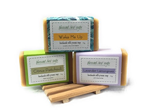Natural Handmade Soap Gift Set - 3 Large 5 Ounce Goat's Milk Bars with Aromatic Cedar Dish - Essential Oil Scents: Wake Me Up, Citrus Patchouli, and Lavendar Lemongrass - Elegant Organza Gift Bag
