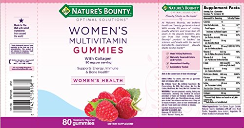 Nature's Bounty Optimal Solutions Women’s Multivitamin Gummies offer a unique formula — created for women, by women — to provide your body with over 10 key nutrients every day in a delicious raspberry and mixed berry flavored gummy.* Nature's Bounty Optimal Solutions Women’s Multivitamin Gummies provide you with the vital nutrients to support a healthy and beautiful body.* Each daily serving provides your body with antioxidant Vitamins E and C, Calcium for bone health and Vitamin D for immune health.* Other key nutrients, like B Vitamins, provide energy support by helping convert food into energy.*Feature