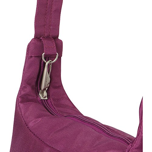 -. Feature : Main compartment has 4 wall pockets for organization / Rear organizer with RFID blocking card and passport slots, wall pocket and pen loop / Front zip pocket locks for added security and is hidden beneath flap / Two mesh expansion pockets hold water bottle, sunglasses or umbrella / Adjustable cut-proof shoulder strap, attaches to post or chair