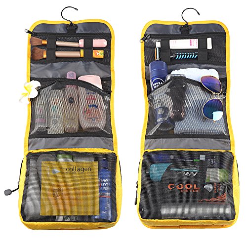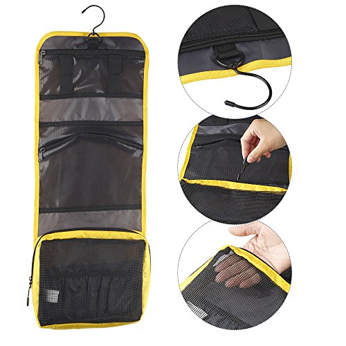 - FOLDABLE AND HANGING TOILETRY BAG -- A Durable Hook that can hang on Hotel's Shower Rod,Towel Rack or Bathroom Door Handles conveniently Saving time and effort in unpacking toiletries or rummaging luggages.