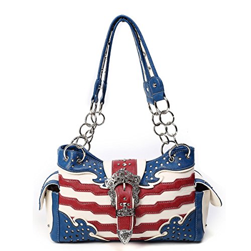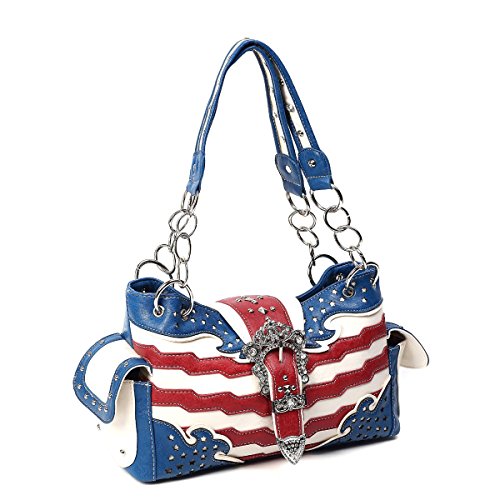 -. Brand : Cowgirl Trendy -. Color : multicoloured -. Department : womens -. Feature : USA western style handbag WITH Concealed carry gun pocket / Created from faux leather and lined in cute floral P.R.Int fabric / Please see description below for full listing of amazing features / Front features intricately carved chunky silver buckle featuring rhinestones and polished silver studs / Overall size is: 15in wide by 8in tall by 4.5in deep - Handles have 10.5in drop to fit over shoulder -. ProductGroup : Shoes -. ProductTypeName : HANDBAG -. Size : One Size -. Title : American Flag Concealed Gun Carry Pocket Purse