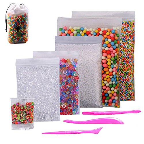 - Package include:total 6 pack (1 pack size 2-3mm mixed color 10g aound 13000pcs,1 pack white 5g around 6000pcs, 1 pack Mix color 7-9mm 8g around 1300pcs, 1 pack clear fishbowl beads 1.76oz/50g around 550pc ,1 pack courful fishbowl beads 1.76oz/50g around 550pc,1 pack Bonus 250pcs fruit splice ,3pcs slime tool