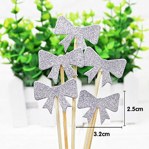 50pcs Cupcake Topper silver Bowknot Cupcake Toppers Wedding Bamboo Fruit Cocktail Forks Party Finger Food Wedding Cupcake Toppers, Bridal Shower Cupcake Toppers Valentine's Day Cupcake Toppers