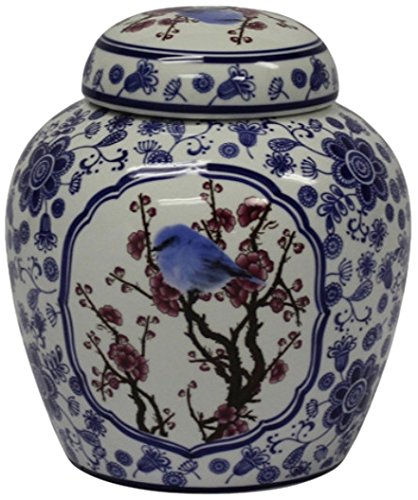 Benzara Lidded Jar with Blue Bird Print Decorative, Blue/White