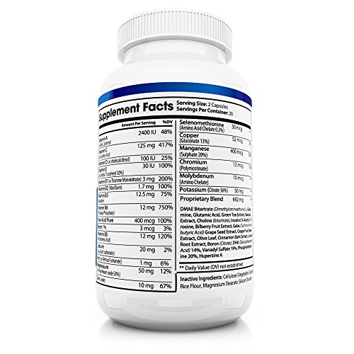 Vitamin A 2400 IU, Vitamin C 125mg, Vitamin D 100 IU, Vitamin E 30 IU, Vitamin B1 3mg, Vitamin B2 1.7 mg, Vitamin B3 12.5mg, Vitamin B6 12mg, Folic Acid Pure 400mcg, Biotin 1% 3mcg , Vitamin B5 12mg, Calcium 20 mg, Iron 1mg, Magnesium 50mg, Zinc 10mg, Selenomethionine 50mcg, Copper 52 mcg, Manganese 400mcg, Chromium 12mcg, Molybdenum 10mcg, Potassium 50mg, Proprietary Brain Boost Blend 692mg (consisting of DMAE Bitartrate, L Glutamine, Glutamic Acid, Green Tea Extract, Bacopa Extract, Choline, Inositol, N-Acetyl L-Tyrosene, Bilberry Fruit Extract, Gaba, Grape Seed Extract, Grape Fruit Seed Extract, Olive Leaf, Cinnamon Bark Leaf, Licorice Root Extract, Boron, DHA, Vanadyl Sulfate, Phosphatidylserine Serine, Huperzine A)