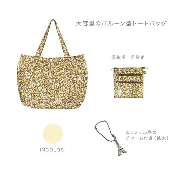 | 肩掛けもできる、大容量のバルーン型のトートバッグ。バッグには内ポケット1つと外側に4つのポケットが付いています。本体のベルトを使えば、キャリーケースへの固定OK。旅行用はもちろん、普段使いにも便利。 |