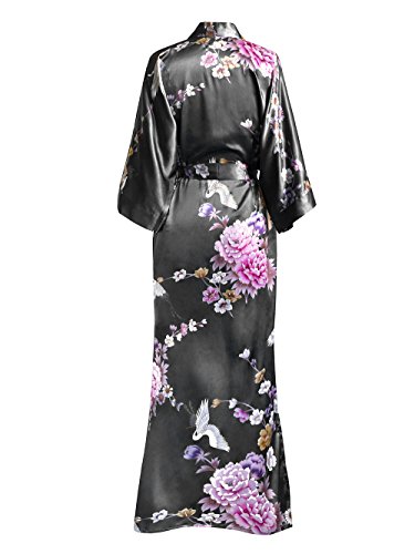 Old Shanghai Women's Kimono Long Robe - Chrysanthemum & Crane - Gunmetal, One Size