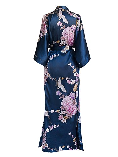 Old Shanghai Women's Kimono Long Robe - Chrysanthemum & Crane (Navy)