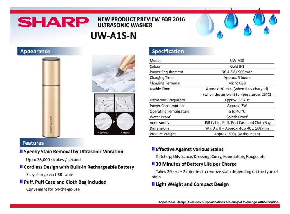 SHARP has designed the Ultrasonic Washer for people with busy lifestyles looking for convenience on-the-go. Rather than pop home to change a stained outfit, forward-thinking consumers can simply carry the compact and lightweight Ultrasonic Washer in their bags for immediate stain removal.