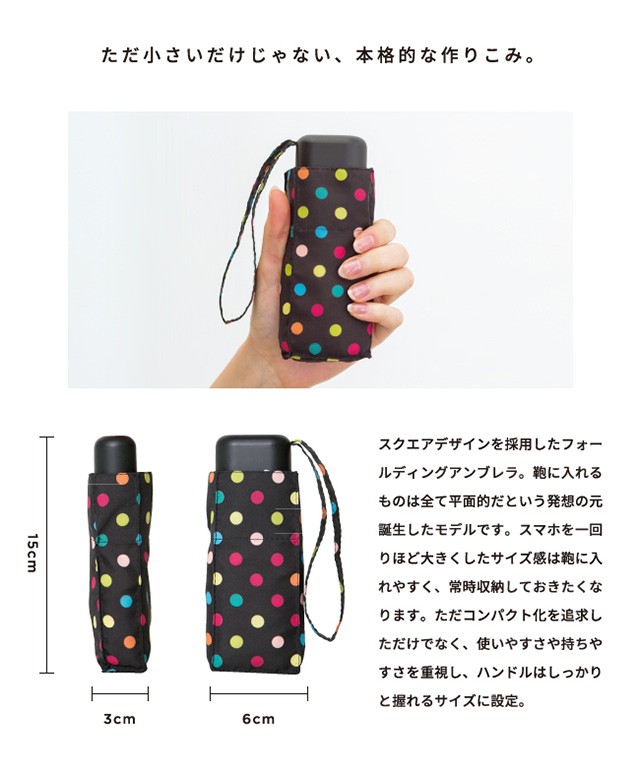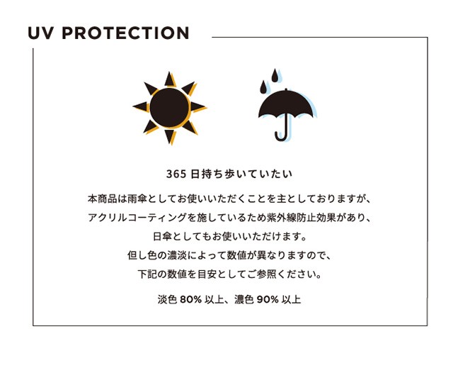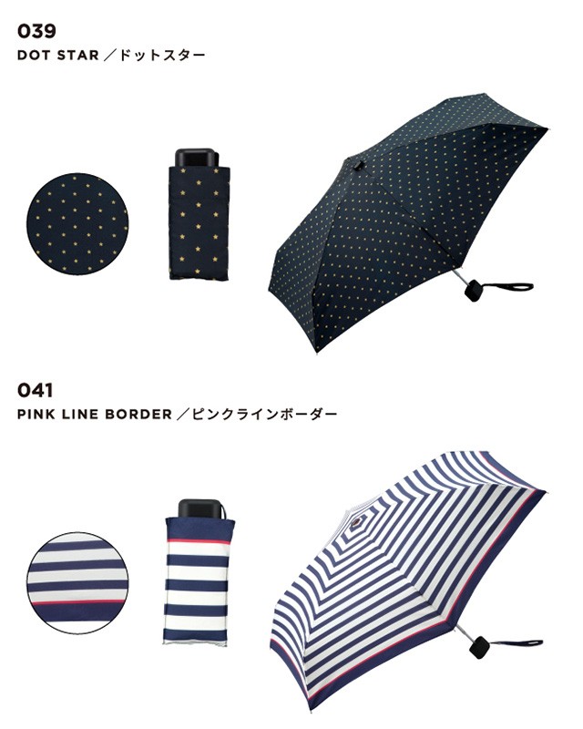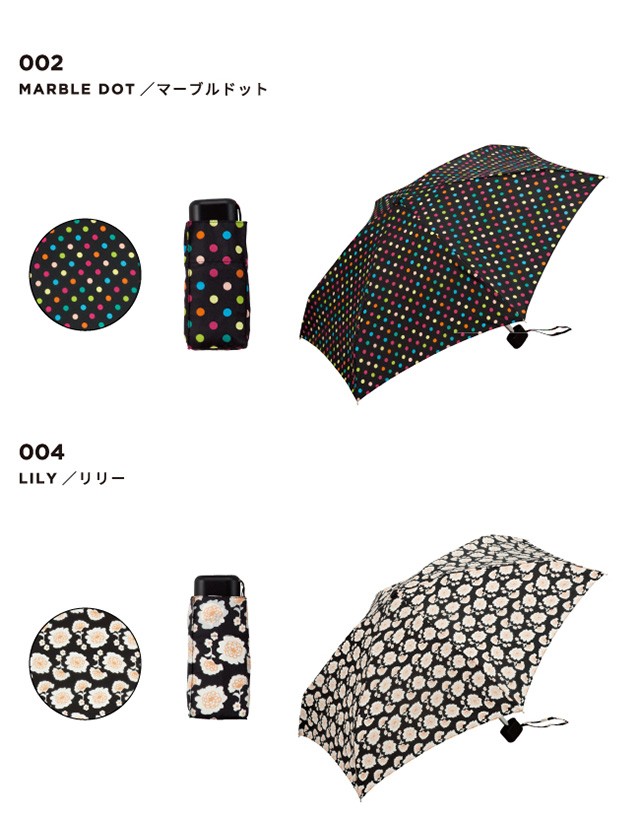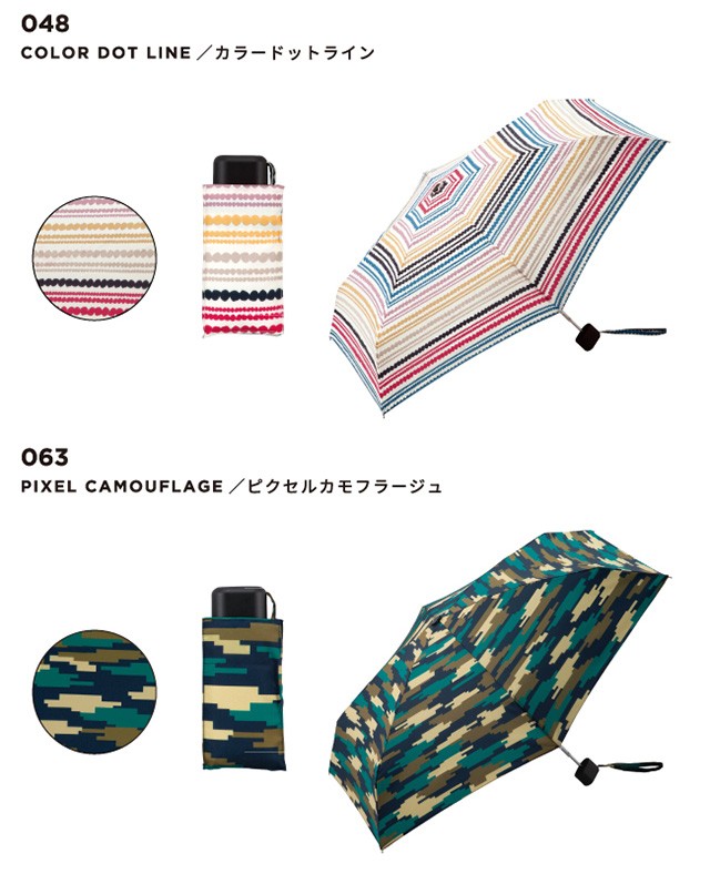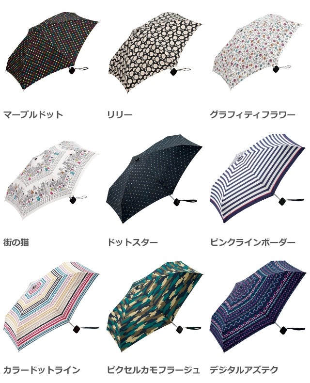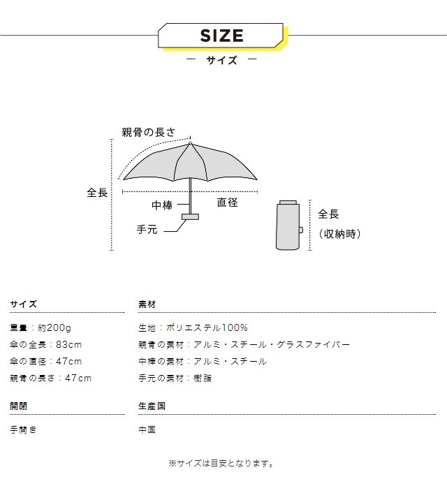 | 仕様 | 傘の重量:約200g 傘の直径:83cm 傘の全長:47cm 親骨の長さ:47cm 親骨の素材:アルミ・スチール・グラスファイバー 中棒の素材:アルミ・スチール 手元の素材:樹脂 開閉:手開き | ||
