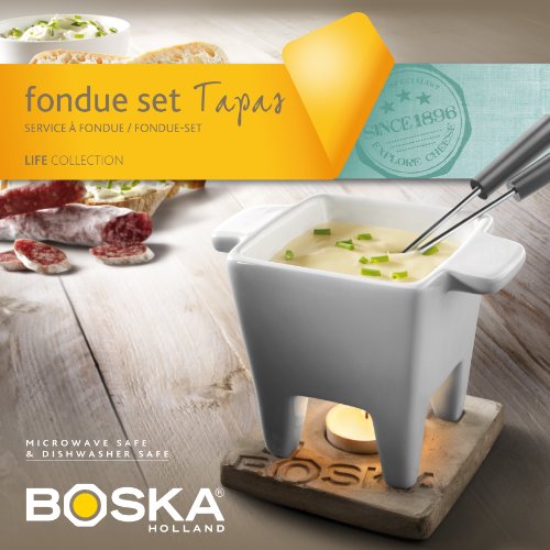 Studio : Boska USA Publisher : Boska USA Binding : Kitchen Product Description At Boska Holland we've been crazy about cheese for over 100 years. It all started near Gouda, home of the original Gouda cheeses, where Willem Boz made his first cheese tools for local cheese farmers. From that day it's our family tradition to inspire you on your journey through the delicious cheeses of the world. Explore cheese and enjoy it. Boska represents beautiful, smart products for cheese. Steal the show with the eye-catching ‘Tapas’ fondue set. for a delicious tapa dish alongside drinks or side dish with dinner. part of the Boska Holland Life Collection which is a unique combination of authentic quality, tasteful design and a dash of tradition. These organically designed products are made of solid natural material, like European white oak with a beautiful coarse grain, rugged concrete and recycled glass. The cheese accessories were created to highlight the pure enjoyment of cheese. the Boska Holland tapas fondue set includes a grey ceramic pot, concrete base, 2 fondue forks and a tea light. Its a modern design with the use of natural materials in the base and in the tapas pot. The small portioned tapas pot provides individual cheese portions for all types of snacks while the tea light keeps cheese melted. Dishwasher safe. 0