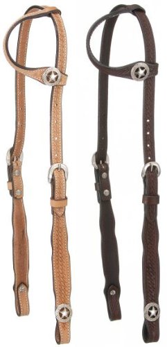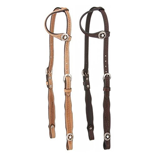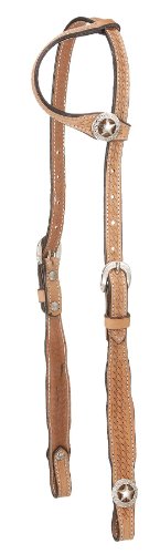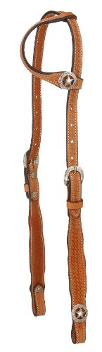 Product Description Single ear headstall with Basketweave throughout and square cheek design. Accented with silver star badge concho at ear and bit ends. 0