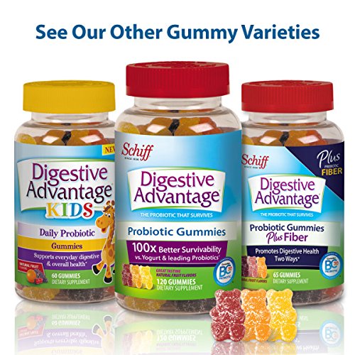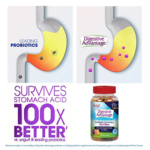 Digestive Advantage Prebiotic Fiber + Daily Probiotic includes 2 ingredients ideal to promote better digestive health! The Prebiotic works naturally with Probiotics and it supports the growth of healthy bacteria. Probiotics are good bacteria that promote digestive health and help reduce minor abdominal discomfort and occasional bloating. With continued use, Digestive Advantage Prebiotic Fiber + Daily Probiotic is ideal for long-term digestive support*. The unique patented probiotic in Digestive Advantage Probiotic Gummies, BC30, is protected by a protein shell which allows it to survive through the harsh conditions of your stomach to reach the intestines where you need it most to promote long term digestive and immune health*. It's the probiotic supplement that survives stomach acid 100x better than yogurt and leading probiotics** *THESE STATEMENTS HAVE NOT BEEN EVALUATED BY THE FOOD AN DRUG ADMINISTRATION. THIS PRODUCT IS NOT INTENDED TO DIAGNOSE, TREAT, CURE OR PREVENT ANY DISEASE. **Based on survivability testing vs. yogurts and leading probiotics including a high potency probiotic brand offering 50 billion live cultures.Feature
